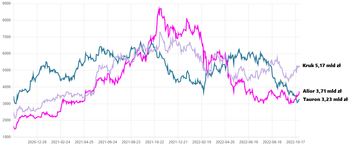 Kruk to największa polska spółka windykacyjna, która w swojej historii jeszcze nigdy nie miała statusu blue chipa. Jej obecna kapitalizacja to 5,17 mld zł, ale jeszcze rok temu wycena spółki przekraczała poziom 7 mld zł. Akcje Kruka – patrząc na statystyki zawieranych transakcji – charakteryzują się dużym zainteresowaniem inwestorów i uważane są za bardzo płynne. Wartość akcji w wolnym obrocie to 2,89 mld zł. Według danych serwisu ATTrader.pl, na akcjach Kruka w ostatnim miesiącu zawierano średnio 681 transakcji dziennie przy obrocie na sesji 3,93 mln zł. Drugi na liście jest Alior Bank, który pod względem wyceny jest mniejszy – kapitalizacja 3,71 mld zł, a wartość akcji w wolnym obrocie to 1,92 mld zł – ale za to płynniejszy. Średnia z ostatniego miesiąca to 1.197 transakcji/dziennie, przy obrocie na sesji 5,15 mln zł. Warto jednak zaznaczyć, że WIG20 ma już w swoim składzie 4 banki. Trzeci na liście rezerwowej Tauron jest wyceniany na nieco ponad 3,2 mld zł, a wartość akcji w wolnym obrocie wynosi 1,74 mld zł.