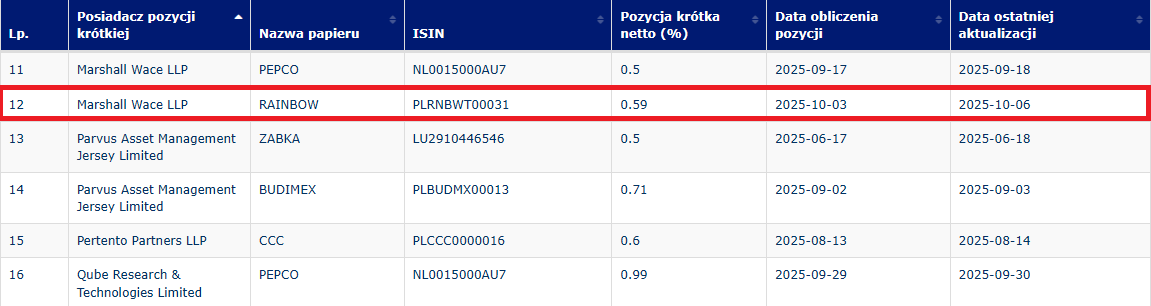 Spadek wyników Rainbow Tours oraz przecena na kursie akcji odbiły się szerokim echem na rynku. Na starcie października jeden z funduszy wyspecjalizowanych w grze na spadki cen akcji ujawnił się w rejestrze krótkiej sprzedaży KNF. Marshall Wace LLP ma na krótko 0,59 proc. akcji Rainbow Tours. To dość niecodzienna sytuacja, bo mowa o reprezentancie mWIG40, który ma relatywnie niedużą kapitalizację (1,7 mld zł) i płynność akcji.