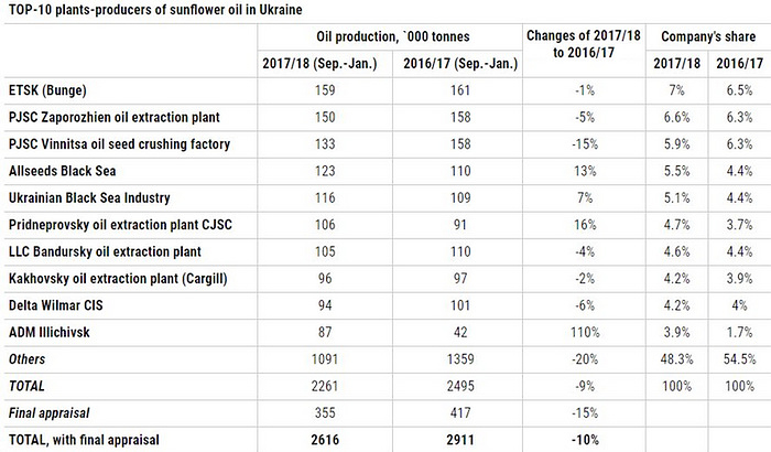 Producenci oleju słonecznikowego na Ukrainie. Źródło: www.apk-inform.com