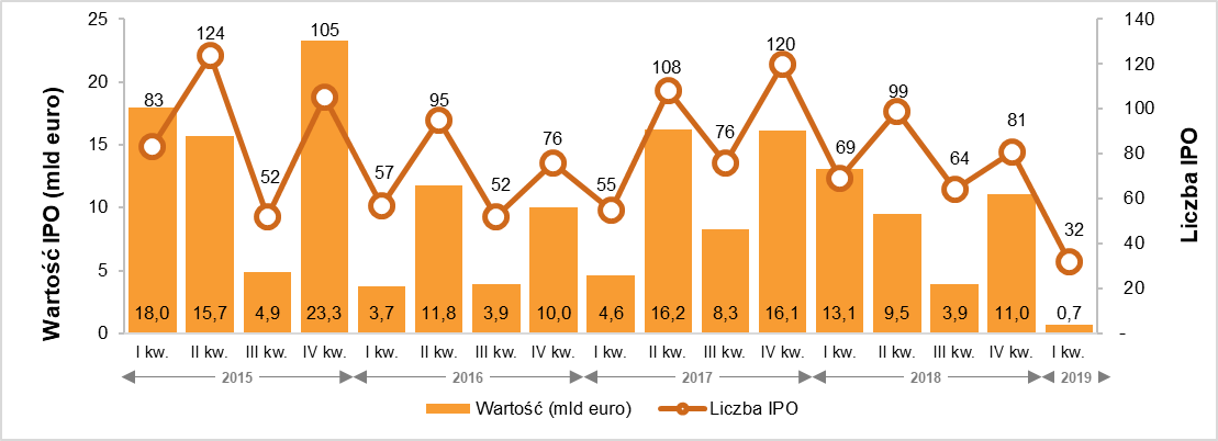 Zgodnie z danymi uzyskanymi przez PwC, w I kwartale 2019 roku łączna wartość IPO w Europie wyniosła zaledwie 0,7 mld euro i spadła w porównaniu do analogicznego okresu poprzedniego roku o 12,4 mld euro. Odnotowano jedynie 32 debiuty (wobec 69 w I kwartale 2018 r.). Liderem w Europie pozostaje giełda w Londynie, na której przeprowadzono oferty o wartości 0,6 mld euro, co oznacza 78 proc. wartości wszystkich IPO na europejskich rynkach w I kwartale 2019 roku.