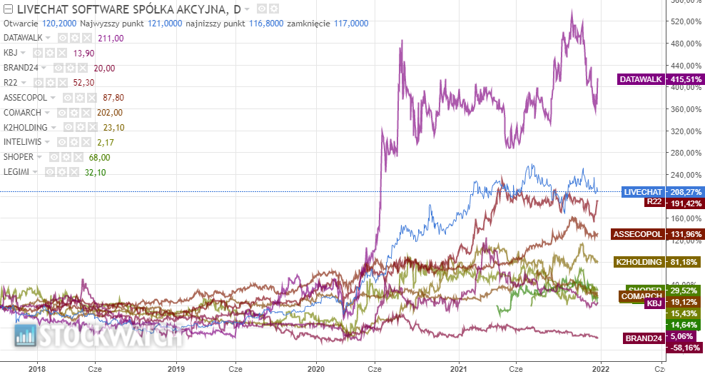 Prekursorem na polskiej giełdzie był wrocławski LiveChat (LVC), który w marcu 2014 roku zadebiutował na warszawskim parkiecie. Na starcie spółka legitymowała się kapitalizacją sięgającą 500 mln zł i wyceną wskaźnikową C/Z na poziomie 50. Być może dla części inwestorów taka wycena wtedy wydawała się abstrakcyjna, ale dzisiaj kapitalizacja spółki sięga 3,1 mld zł, a bieżący wskaźnik C/Z kształtuje się w okolicach 27.