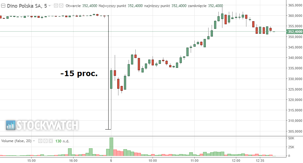 Nerwowy początek sesji zaliczyło Dino Polska. Jej akcje tąpnęły w reakcji na opublikowane wyniki kwartalne. Na szczęście przecena była chwilowa i po porannym spadku do 306 zł z 360 zł wczoraj na zamknięciu, po 4 godzinach notowań akcje te kosztowały 355 zł, czyli jedynie o 1,5 proc. mniej niż w czwartek na koniec dnia. Nie jest wykluczone, że do końca sesji całość strat zostanie odrobiona.