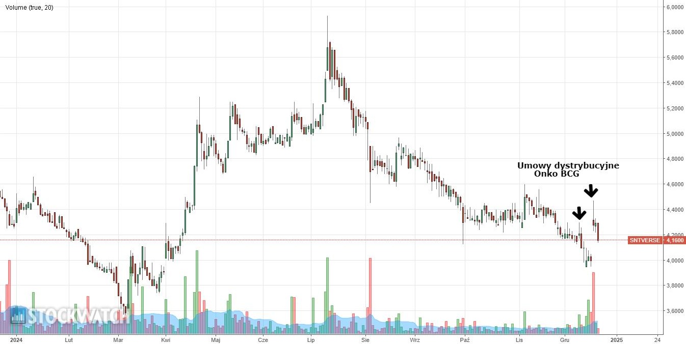 To był kapryśny rok dla akcjonariuszy Synthaverse. W pierwszym półroczu notowania dawnego Biomedu-Lublin najpierw spadły z okolic 4,30 zł do 3,60 zł, a już w lipcu otarły się o 6 zł. Z kolei druga połowa br. stała już pod znakiem korekty, która sprowadziła tegoroczną stopę zwrotu na minus. Skalę strat ograniczyła niedawna informacja o umowie dot. współpracy w zakresie rejestracji, dostawy i dystrybucji Onko BCG w Ameryce Południowej.