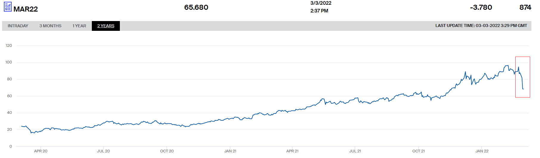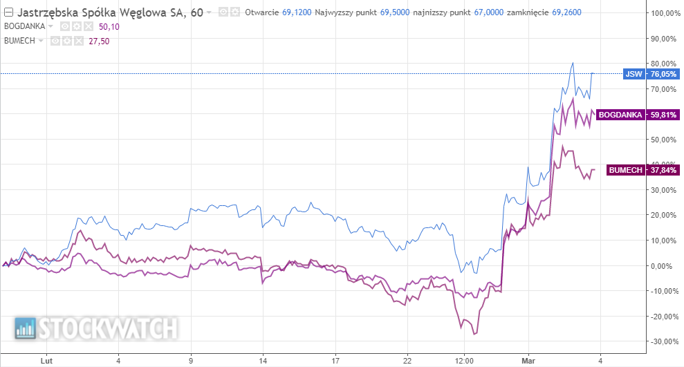 W zawrotnym tempie drożeją paliwa, czyli ropa, gaz i węgiel. W środę na giełdzie ICE kontrakty terminowe na węgiel na przyszły rok wzrosły aż o 51 proc. do 288 dolarów za tonę. Kontrakty terminowe na kwiecień podskoczyły o 50 proc. do rekordowego poziomu 450 USD/t. Wszystko przez sankcje nałożone na Rosję i obawy o możliwy niedobór surowca. W środę premier Morawiecki zasygnalizował, że Polska może nałożyć embargo na rosyjski surowiec. To wszystko to woda na młyn dla polskich kopalń. Choć w czwartek JSW, Bogdanka i Bumech zaliczają kilkuprocentową przecenę, to w nieco szerszej perspektywie są na wysokich plusach.