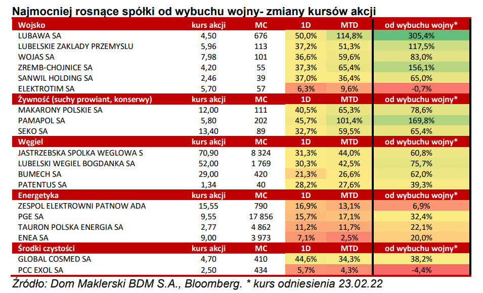 – Podobnie jak 2 lata temu, po pandemii, inwestorzy poszukują atrakcyjnych sektorów/spółek mogących wykorzystać obecną sytuację konfliktu militarnego na Ukrainie. Obecnie najmocniej rosnącymi spółkami są te z asortymentem wojskowym, wykorzystujące kryzys humanitarny czy kopalnie/energetyka. Podobnie jak w pandemii wiele tych wycen zostanie szybko zweryfikowanych – sygnalizują eksperci DM BDM.
