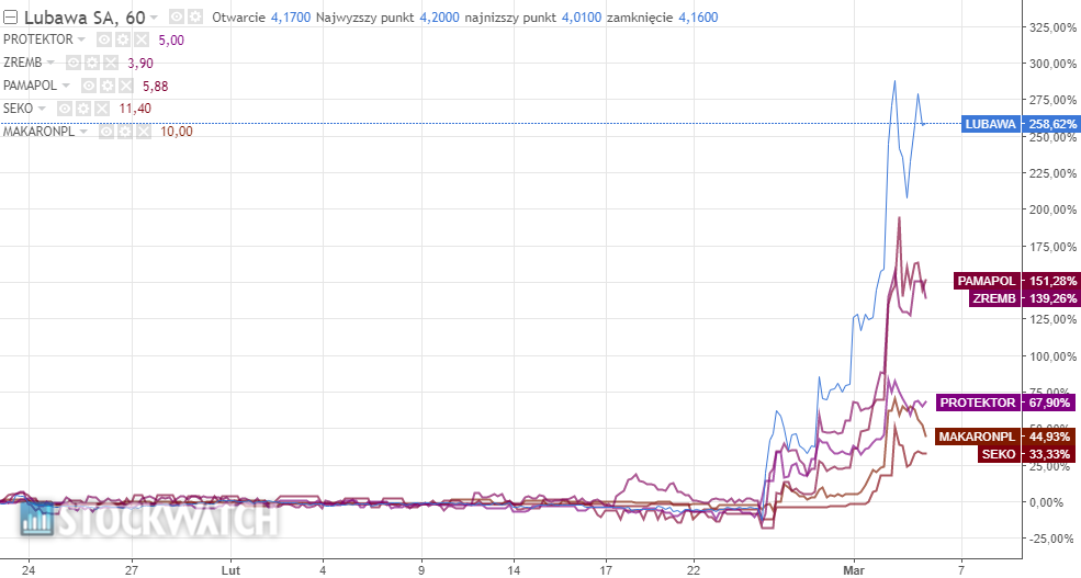 GPW W ciągu zaledwie 5 sesji akcje Lubawy, czyli producenta kamizelek kuloodpornych oraz namiotów wojskowych podrożały czterokrotnie. Notowania Protektora, czyli dostawcy obuwia specjalistycznego dla wojsk mundurowych urosły o 117 proc., a Zrembu (dostawcy m.in. kontenerów polowych) o 156 proc. Trzycyfrową zwyżkę zanotował też Pamapol (+170 proc.). Tu warto odnotować, że perspektywa tłustego zysku skusiła dwóch wiceprezesów producenta dań gotowych. W środę Krzysztof Półgrabia i Bartosz Półgrabia sprzedali akcje Pamapolu za 0,5 mln zł. Wysokie dwucyfrowe wzrosty zanotowały też akcje Makaronów Polskich i Seko.