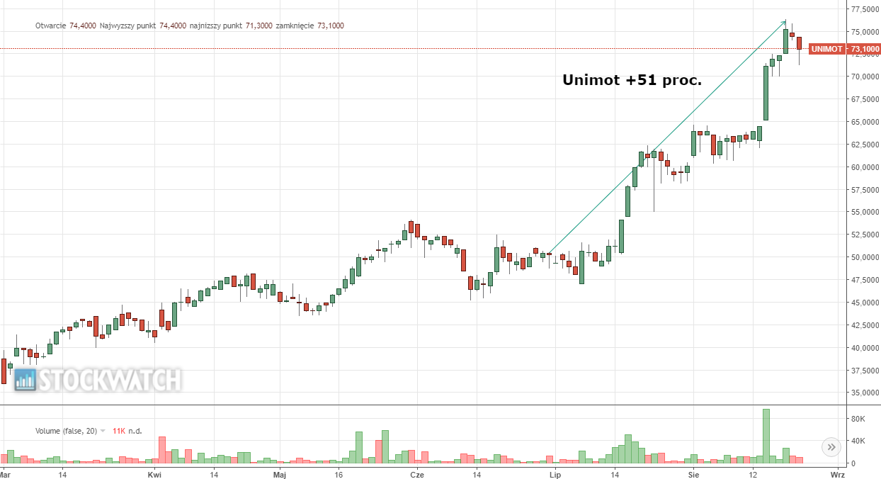 Oprócz Unimotu na liście top picks na najbliższy miesiąc znalazły się jeszcze: AB, Action, Asbis, Asseco Poland, Arctic Paper, Big Cheese Studio, Bogdanka, Eurocash, InterCars, LiveChat, LPP, LSI Software, Mirbud, Neuca, Orange PL, PCC Rokita, PKN Orlen, PlayWay, Selvita, VRG i Votum.